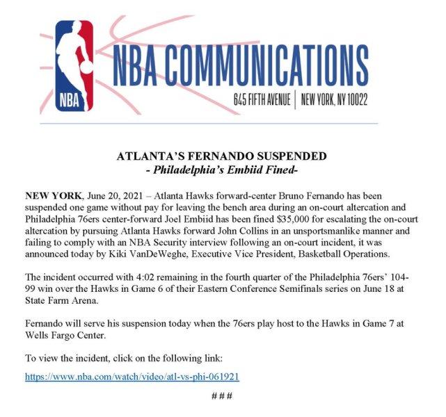 24直播网讯 北京时间6月21日,NBA官方宣布,在东部半决赛的第6场比赛中,费城中锋乔尔-恩比德因为升级了和老鹰前锋科林斯的冲突,遭到35000美元的罚款。