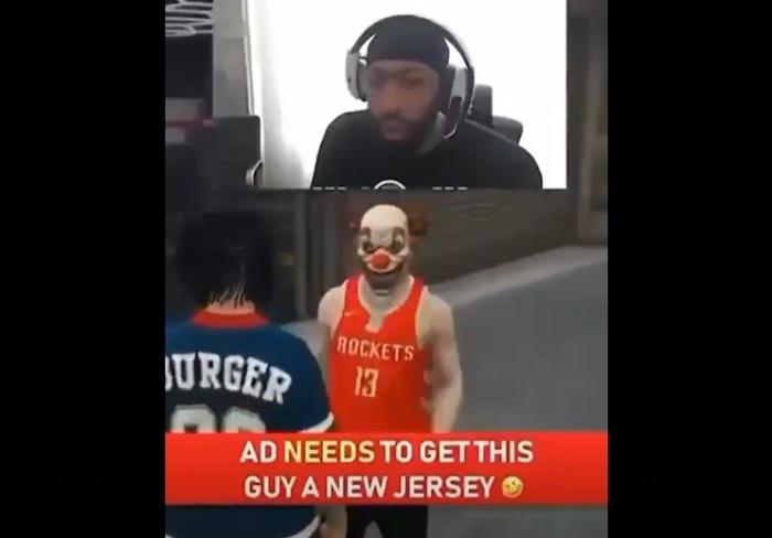 在游戏中,浓眉哥遇到了一个角色身穿火箭哈登球衣的玩家,浓眉哥是直接开启了嘲讽,浓眉对该球迷说:你这个蠢X,他(哈登)都不为你们打球了。不过该玩家也没有给浓眉哥好脸,直接爆粗回击了浓眉哥。
