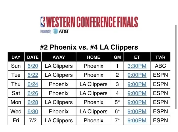 24直播网讯 快船没有等到抢七,最终在今天完成25分的大逆转解决了战斗送对手回家,现在西决的日程表已经出炉了,他们将会在两天后与太阳上演西决G1!