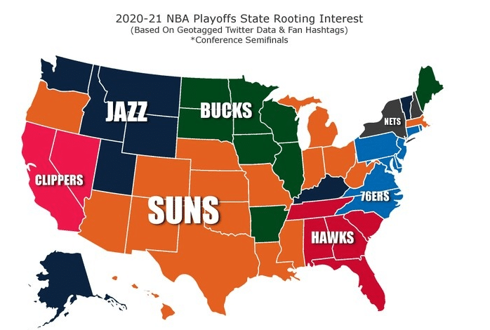 那么说全美最看好哪支球队可以夺得本赛季NBA总冠军呢?《Bet Online》根据推特用户地理位置搜集了目前球迷们对本届NBA球队的夺冠支持数据,这其中数据显示,有多达17个州支持太阳夺冠,篮网和快船则是垫底。