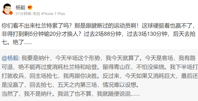 可是纳什坚持使用杜兰特到最后的5分钟,直到完全没有希望才让杜兰特下场休息,两场比赛打了88分钟,连杨毅都吐槽,你看不到杜兰特累了吗?这可是跟腱断过的球员啊?