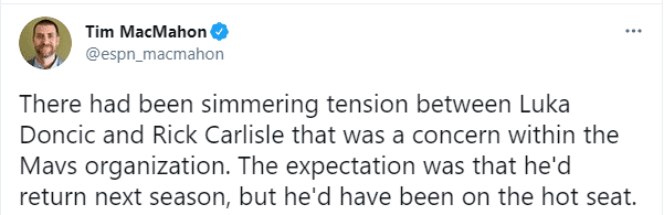 为何卡莱尔突然辞职?名记麦克马洪透露背后实情,他发推写道:东契奇和卡莱尔之间的紧张关系一直都在发酵,这是独行侠内部的一个担忧;东契奇支持独行者助教贾马尔-莫斯利成为球队新帅,他曾表示:莫斯利可以成为主教练,拥有成为主帅的一切条件。