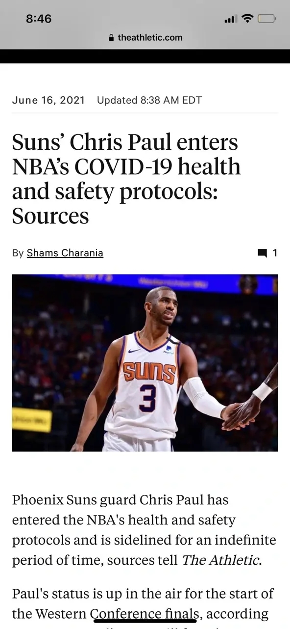 24直播网讯 北京时间6月16日,名记Shams突然爆料爆炸性新闻,太阳核心控卫克里斯保罗因为触发了联盟健康与安全协议,将会无限期缺阵!