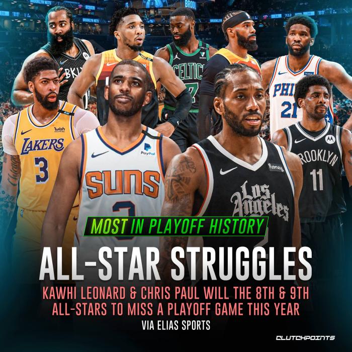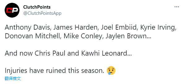 美媒ClutchPoints晒出今年季后赛中遭遇伤病的9位全明星——浓眉(腹股沟拉伤)、哈登(腿筋伤势)、米切尔(脚踝伤势)、杰伦-布朗、康利、恩比德(半月板伤势)、欧文(脚踝扭伤)、保罗(肩伤和确诊阳性无限期缺阵)和小卡(十字韧带伤势),直言:伤病毁了这个赛季。