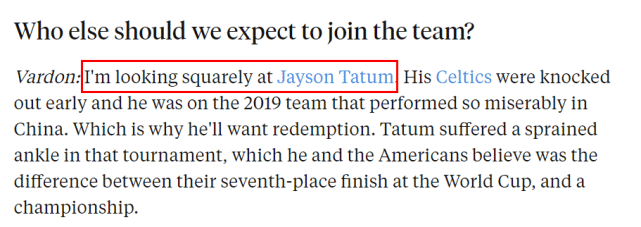 名记Joe Vardon预测将是杰森-塔图姆。凯尔特人已经早早被淘汰,而作为2019年美国男篮的一员,塔图姆经历了世界杯的低谷,那次美国男篮只获得第七的成绩。Vardon认为塔图姆肯定希望通过赢下奥运金牌,来进行自我救赎。