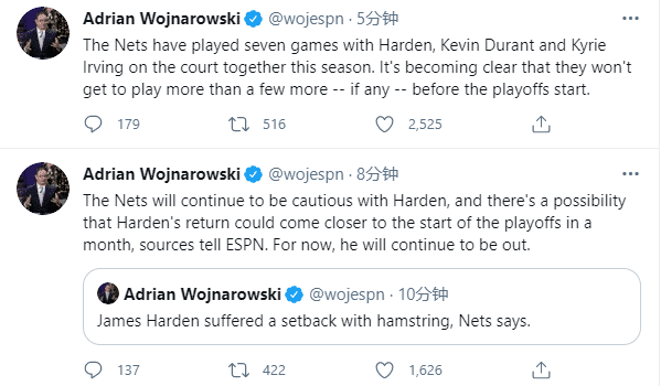 24直播网讯 篮网官宣坏消息,哈登在训练中遭遇不幸,腿筋拉伤的伤势复发,被列为无限期缺阵,没有复出时间表;ESPN名记透露哈登最快也要到季后赛前才能复出;杜兰特伤停,哈登伤势复发,篮网的冲冠赛季真是太难了,就连劳模哈登也惨遭伤病的侵袭。