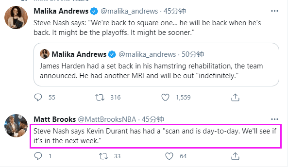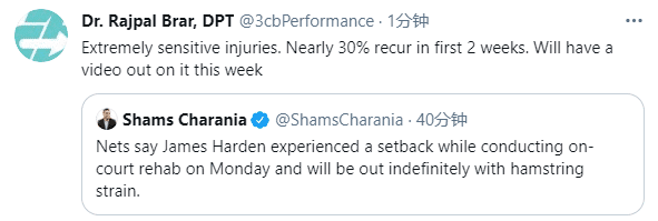 据医学专家分析,腿筋伤势在复出前两周的复发率是30%,哈登不幸遭遇腿筋伤势复发,哈登归期未定;不过杜兰特伤势无大碍,据纳什透露:杜兰特接受了检查,他的伤势比哈登乐观,结果让人挺放心的,被列为每日观察的对象,他有可能下周复出。