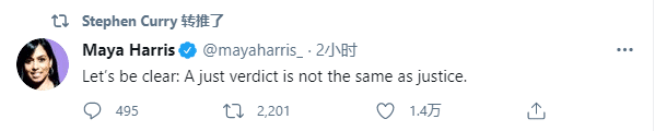 库里转发Maya Harris的动态:让我们清楚一点:公正的判决和正义是不同的。