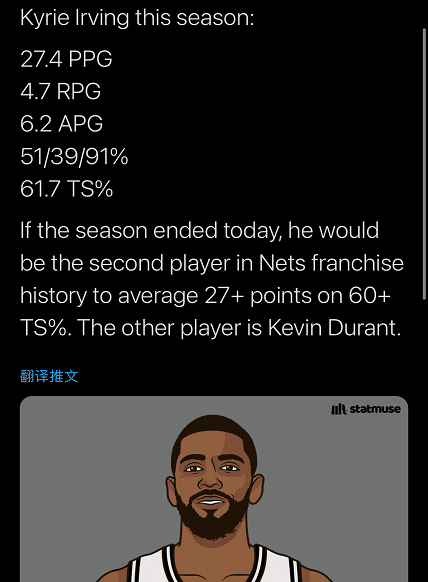 这场比赛篮网最大的赢球功臣毫无疑问是欧文,他在最后1分钟连续打进关键球,制胜防守和两罚全中更是为篮网直接锁定胜局。根据数据统计,欧文本赛季至今场均可以得到27.4分4.7篮板6.2助攻,其中投篮命中率51%、三分球命中率39%、罚球命中率91%,妥妥的180俱乐部成员。同时欧文的真实命中率达到了61.7%。,欧文成为队史第二位场均至少27分同时真实命中率达到60%+的球员,第一位是因伤缺阵的杜兰特。