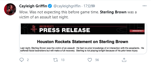 休斯敦火箭官宣,发表声明:球队后卫斯特林-布朗在昨晚的一次袭击事件中受伤,他事先对袭击者一无所知,也没有与之发生接触;斯特林-布朗的面部被划伤,将会完全康复,他今天缺席比赛是因为之前的膝伤,而不是脸伤。