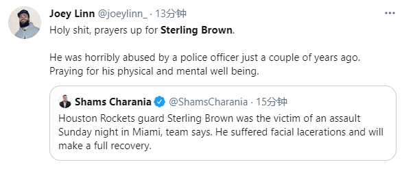 Joey Linn发推写道,为斯特林-布朗而祈祷,几年前,他被警察虐得很惨,为他的身心健康而祈祷;Cayleigh Griffin发推写道:哇哦,赛前谁能想到这一点,斯特林-布朗是袭击事件的受害者;说实在的,这真是疯狂的事情。
