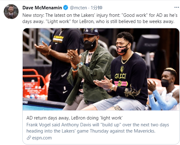 常规赛将在5月中旬结束,大概还剩下三周多的比赛,湖人还剩下12场比赛,预计詹姆斯会在常规赛快结束时复出,然后就是每场必争的季后赛;说实在的,留给詹姆斯调整状态的时间真不多了,但愿老詹早日100%痊愈归来。
