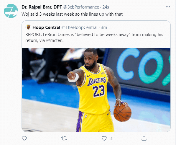 赛季至今,36岁詹姆斯已经为湖人打了41场比赛,场均25.4分7.9篮板7.9助攻,因脚踝扭伤连续缺席16场比赛;詹姆斯伤愈进展顺利,湖人记者Dave McMenamin报道,相信詹姆斯将在几周后伤愈复出;上周ESPN名记沃纳罗斯基透露詹姆斯将在3周后复出,医学专家表示,这和之前的相吻合,这意味着詹姆斯两周后复出。