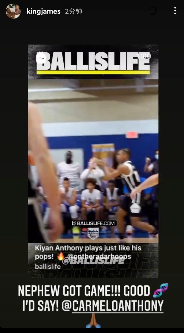 詹姆斯转发的视频是安东尼的儿子基扬-安东尼的比赛集锦。集锦中,基扬-安东尼内突外投,展现了成为一个顶级得分手的潜力。Ballislife发出这段视频时,也配文道:“基扬-安东尼打球就像他的父亲。”