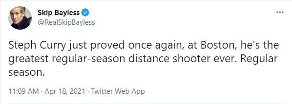 福克斯体育名嘴Skip Bayless发推“库里今晚在波士顿再次证明,他是常规赛最伟大的射手,常规赛。”看似称赞却仿佛是在贬低,库里季后赛三分就不准了吗?这一战几乎就是季后赛的级别了,贝兹莫尔感慨“库里是最棒的球员,他让队友们都拿出更好的状态,总是能吸引2-3名防守球员……经常被遭遇对手冲撞,几乎每场都是……他从没抱怨过一次。”