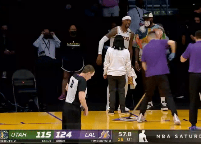 终场前57.8秒,波普上篮时腿下一软,捂着小腿坐在地板上,表情痛苦,湖人队医赶紧冲过来,詹姆斯也第一时间走过来,一直站在波普旁边;然后波普坐在场边休息,赢球后波普一瘸一拐返回更衣室;赛后名记Mike Trudell报道,湖人官方证实波普小腿无碍,仅仅只是右小腿抽筋而已。