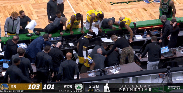 24直播网讯北京时间4月18日,勇士和凯尔特人比赛中,末节场上连续发生意外事件,勇士球星安德森拼命救球,从技术台桌子上翻越过去,奋不顾身直接摔倒在场边,撞翻场边的物品,倒地不起,勇士众队友围过来,最终安德森用毛巾捂着头离场。