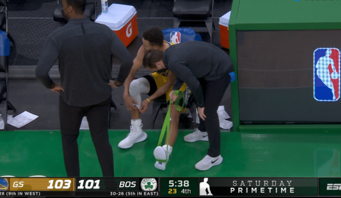 比赛期间,勇士当家球星库里也不幸崴脚受伤,当安德森倒地不起时,库里在场边紧急治疗脚踝;由于脚踝太痛,库里站在场边临时吃止痛药,继续带伤作战,勇士全队真是太拼了,安德森拼到头破血流,被迫离场返回更衣室,库里则是带伤不休息。