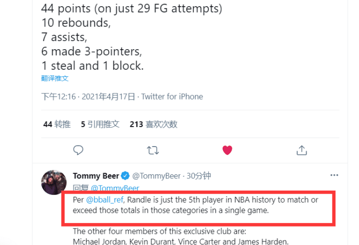 据数据统计,兰德尔还是NBA历史上第5位单场打出至少44分10板7助攻6记三分1断1帽的球员,比肩乔丹、卡特、杜兰特和哈登。赛季至今,兰德尔场均23.2分10.6板6助攻,可以说是全联盟最全能的球员之一!