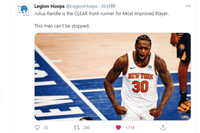 美媒legion hoops表示:兰德尔毫无疑问是进步最快球员的领跑者!这个男人不可阻挡!