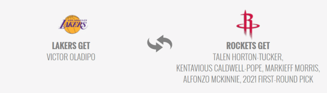 交易方案如下:湖人送出霍顿-塔克、波普、马基夫-莫里斯、麦金尼、2021年的首轮签,得到火箭的奥拉迪波。