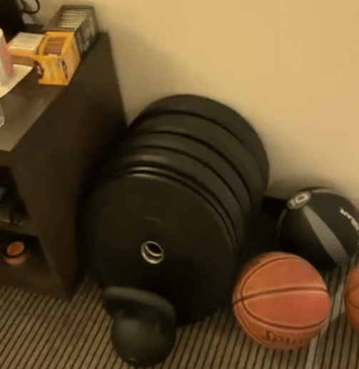 柜子里面有个小的冰箱,自己会在沙发上午休和看书,还可以泡一杯茶和咖啡。还有就是训练的装备了,自己在房间内保持身体的状态,就需要用到它们。剩下的就是林书豪的鞋子和洗刷的屋子了。