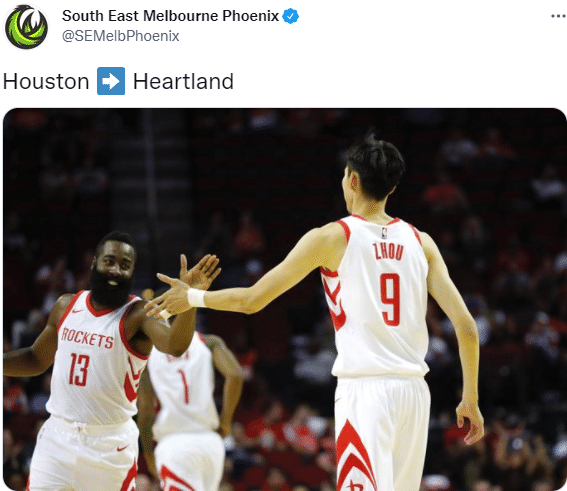 周琦也曾是火箭队的一员,16年第43顺位被火箭选中,不过周琦仅仅在火箭打了两年,出战19场比赛,场均上场6.6分钟仅拿到1.3分1.2篮板;墨尔本凤凰队官方晒出周琦昔日和哈登击掌庆祝的合影,配文:从休斯敦到Heartland。