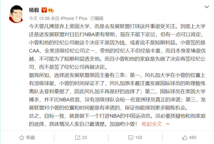 第三个原因就是当时招募他去冈萨加助教离开了,所以未来规划很不确定!整体来说,曾凡博还是有很好的前景的。国内名嘴杨毅也分析了他的这个事情,基本上总结出来的原因跟这些差不多,但他提出了重要的一点“小曾和他的经纪公司做这个决定不是因为钱,或者说不是短期利益。小曾签的是CAA,全美顶级经纪公司之一,带他的经纪人不但经验丰富,而且本身家境很优越,不可能为了短期利益透支他。”