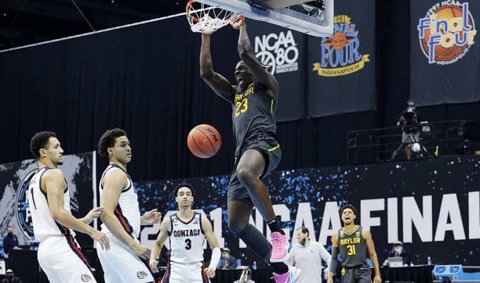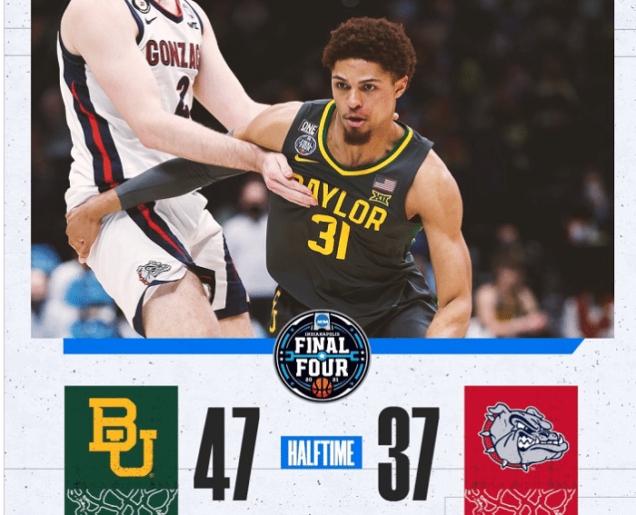 阿亚伊打板命中,贾里德-巴特勒两罚全中,梅耶翻身小跳投命中,戴维恩-米切尔两罚全中,贝勒大学第一次领先20分。萨格斯三分命中止血,萨姆巴两罚全中,萨格斯三分再中,萨姆巴第五次犯规下场。基斯珀特三分命中,弗拉格勒两罚全中,萨格斯被违体,他两罚中一。马西奥-蒂格打板命中,阿亚伊受伤下场,弗拉格勒两罚中一。之后贝勒大学一直保持领先,他们成功击败冈萨加大学,勇夺校史首冠。