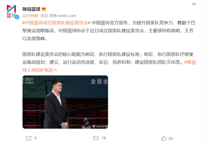 中国篮协官方宣布,为提升国家队竞争力,着眼于巴黎奥运周期备战,中国篮球协会于近日成立国家队建设委员会,主要领导有姚明、王芳以及胡雪峰。姚明担任主任,王芳为执行主任,胡雪峰担任委员会助理主任,从篮协发布的信息来看,这个部门的成立就一个目标:做好应对下一届奥运会的准备,解决东京奥运会遇到的问题!
