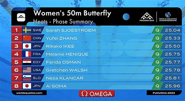 24直播网讯07月28日,福冈世锦赛继续进行,女子50米蝶泳,中国名将张雨霏以25秒33的成绩,晋级到半决赛。张雨霏是上届世锦赛该项目的铜牌获得者,来到福冈之后,剑指金牌。