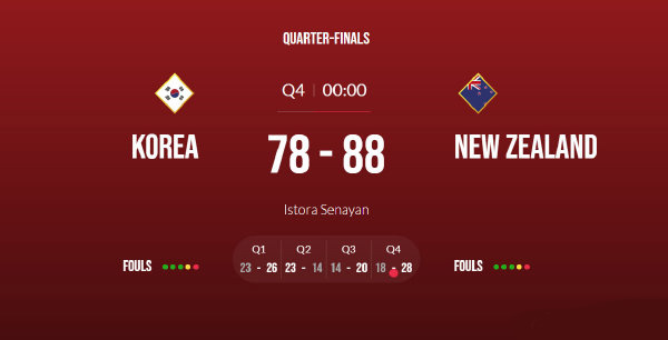 24直播网北京时间7月21日讯,男篮亚洲杯1/4决赛结束了最后一场较量,韩国男篮对阵新西兰男篮,最终经过四节比赛战罢,韩国男篮站着出局,球队在2名球员无法出场的情况下,本场对阵新西兰又要两人被罚下,最终78-88输给新西兰,无缘四强。