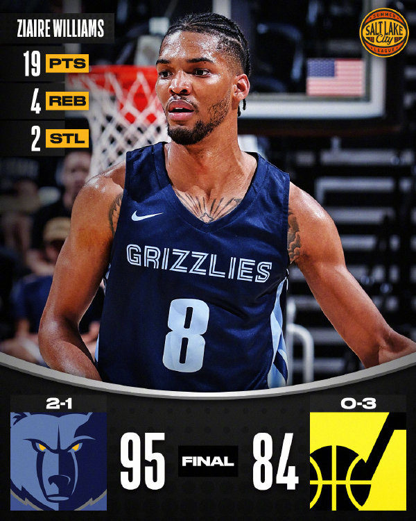 灰熊:扎伊尔-威廉姆斯19分4篮板2抢断,蒂尔曼10分14篮板4助攻,罗迪16分5篮板,阿尔达玛14分8篮板,拉拉维亚6分3篮板3抢断,钱德勒12分2助攻,布查南8分7篮板2助攻,沃特斯10分5助攻4抢断。