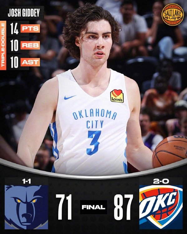 NBA犹他夏季联赛继续进行,雷霆对阵灰熊。昨天的比赛里,新科榜眼霍姆格伦的首秀非常精彩,他也带队大获全胜,灰熊则是全民皆兵险胜76人。一开场,灰熊连中三分取得领先,雷霆内外开花打出11-0的攻击波后灰熊回敬10-2的小高潮,双方20平结束首节。次节上来,雷霆多点开花取得领先,灰熊一波9-2一度反超,基迪和霍姆格伦联手拿到10分帮助雷霆以48-43领先结束上半场。易边再战,雷霆牢牢占据场上主动,再度轰出10-0的攻击波,三节打完雷霆领先15分。第四节,灰熊展开反击努力缩小分差,基迪带队稳住局势并将优势保持到了最后,最终,雷霆轻取灰熊,取得2连胜。