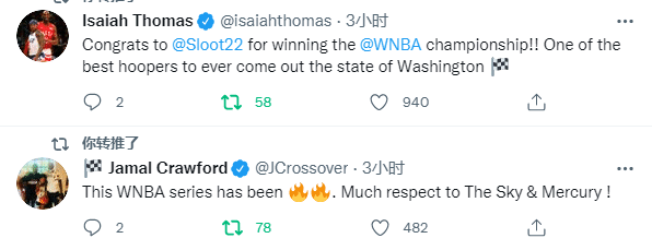 贾马尔-克劳福德发推:WNBA这个系列赛太火了,向天空和水星致敬;小托马斯发推:恭喜考特尼-范德斯洛特赢得WNBA总冠军,华盛顿州有史以来最好的篮球运动员之一。