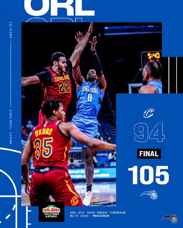 魔术:戈登15分8板3助、武切维奇16分7板6助、培根19分2板、罗斯20分2板2助、伯奇6分10板2助