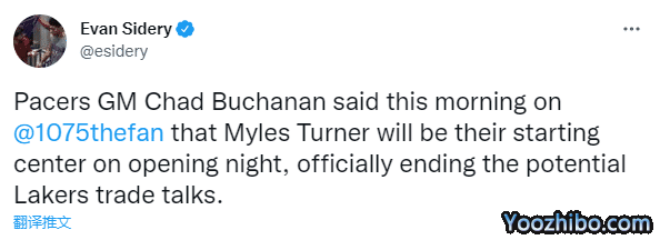 24直播网09月22日迈尔斯-特纳已经确定留守步行者,据NBA记者Evan Sidery报道,步行者总经理Chad Buchanan在节目中表示,特纳将在新赛季揭幕战继续担任球队的首发中锋,正式结束与湖人之间的潜在交易谈判。