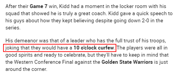 主帅基德在更衣室发言时更是调侃起太阳,他对球员们说:“嗨!宵禁!10点钟!”大家哈哈大笑,此前有报道称保罗要求太阳球员季后赛宵禁,但保罗本人否认了这一说法。独行侠和勇士的西决G1将在北京时间5月19日9点打响。