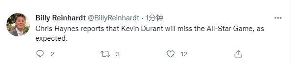 24直播网01月26日讯 ,篮网坐镇主场对阵湖人,杜兰特和欧文双双缺阵,由于遭遇左膝韧带扭伤的伤病,杜兰特至少伤停4-6周,这意味着他无法参加今年的全明星赛,据雅虎记者海耶斯报道,杜兰特因伤无缘NBA克利夫兰2022年全明星赛,连续三年不出战全明星赛。