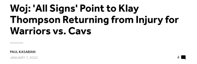 汤普森在1月10日的比赛中复出,将意味着941天的苦等终于结束。沃纳罗斯基表示,库里的股四头肌伤病并无大碍,他预计能和汤普森一起打对阵骑士的比赛。