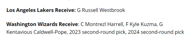 在浓眉和詹姆斯缺阵的比赛中,库兹马的表现并不好,Massey把他称为“湖人最大的失望之一”。湖人能用库兹马换谁呢?美媒Bleacher Report近期建议湖人和奇才交易,尝试用哈雷尔+库兹马+波+两个次轮签去换威斯布鲁克。詹姆斯、浓眉和威少若是能组成三巨头,想必会吸引更多的关注。