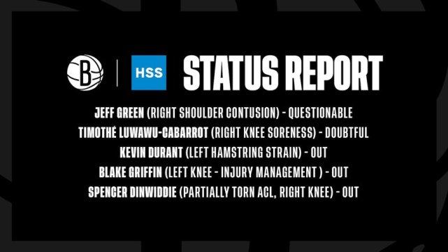 除了杜兰特、格里芬和赛季报销的丁威迪,篮网另有两名球员不一定能出战绿军。杰夫-格林(右肩挫伤)是questionable(出战成疑,50%上场可能),卢瓦乌-卡巴罗特(右膝酸痛)是doubtful(大概率不打,25%上场可能)。