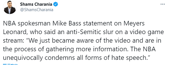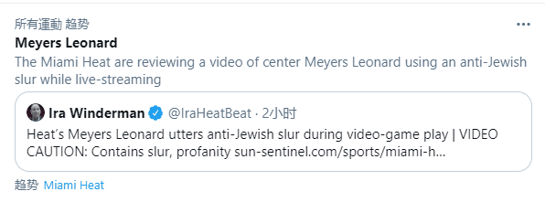 反诽谤联盟@热火官方和NBA官方,发推写道:“看到梅耶斯-伦纳德使用这种丑陋的、攻击性的反犹太主义的辱骂,我们感到震惊和失望。我们已经联系了热火队和NBA联盟,并敦促伦纳德先生立即为这种令人震惊和仇恨的言论道歉!