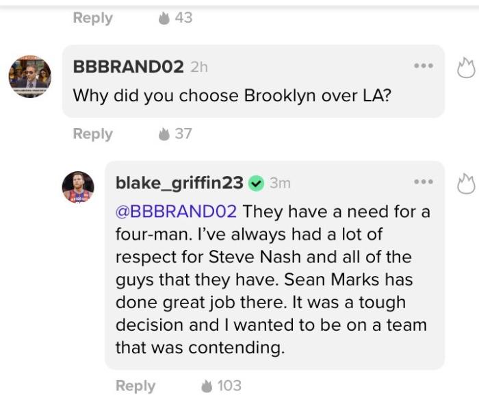 谈到为何加盟篮网拒绝了其他诸多球队,据《B/R》报道格里芬表示“我们是老朋友了(小乔丹),任何你熟悉的人,都会让事情变得更简单,这肯定起到了一定作用。他们(篮网)需要一位4号位球员,另外我一直非常尊重纳什、肖恩马克斯,这个决定很艰难,但我想成为他们其中的一员去竞争总冠军”