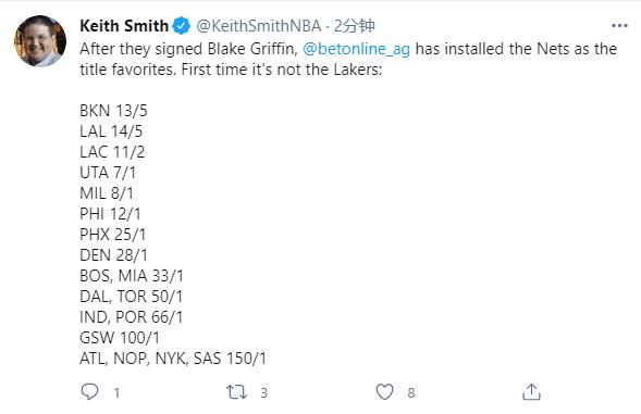 之后,博彩公司更新了本赛季的总冠军赔率,其中,篮网超越湖人升至榜首。这是湖人本赛季首次在总冠军赔率中跌至第二位。能够感受到现在篮网已经成为了最具冠军相的球队,湖人仍很强,但他们的角色球员阵容可能无法与篮网相比!