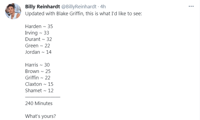 格里芬加入篮网,他将扮演怎样的角色?此前美媒报道称,篮网计划让格里芬打替补,扮演小球阵容的中锋。那么,篮网新的轮换阵容会是怎样的?跟队多年的记者Billy Reinhardt预测了篮网的新轮换时间分配(括号内为预测场均上场时间)——
