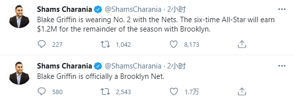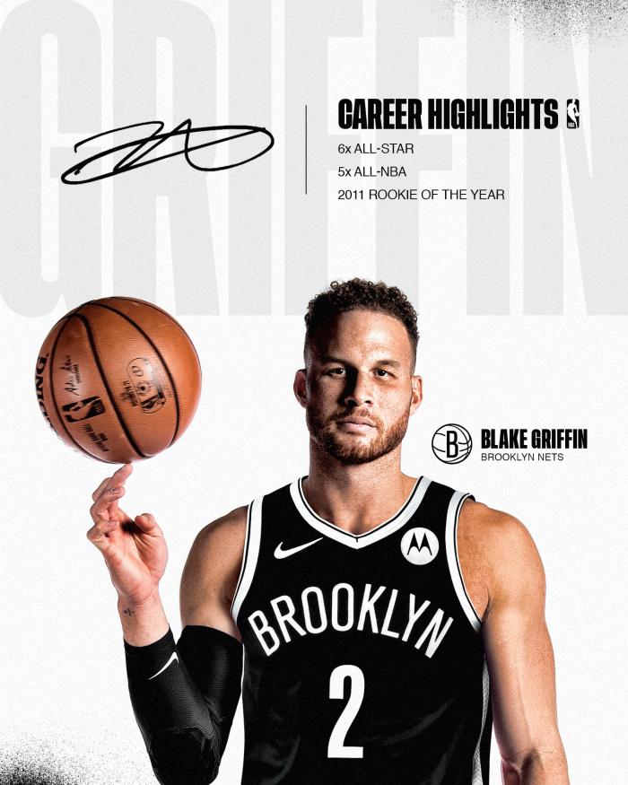 24直播网3月9日讯 全明星赛之后的第一天,布鲁克林篮网正式官宣签约布雷克-格里芬,晒照并且欢迎格里芬来到布鲁克林;据名记shams报道,加盟篮网后格里芬改穿2号球衣,新合同也随之曝光。