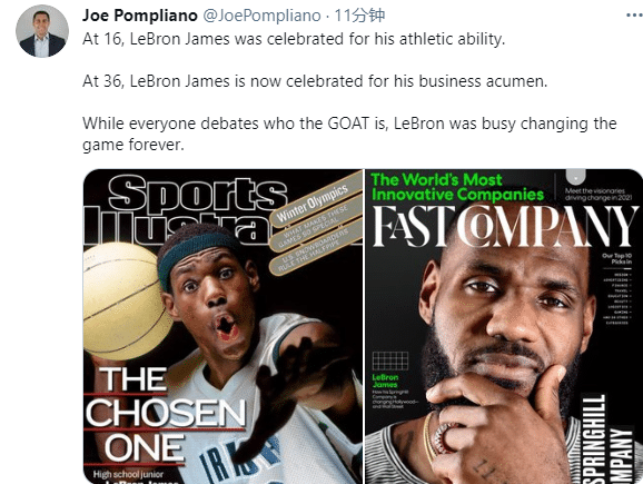 另外要说的是恭喜詹姆斯登上商业杂志的封面,名记调侃詹姆斯16岁时因运动能力而出名,如今36岁詹姆斯因商业头脑而闻名;登上封面接受采访期间,记者问他是否会开发梳子等周边产品,詹姆斯回应:你看到我的头发了吗?要是我卖梳子,那就是在欺骗大家。