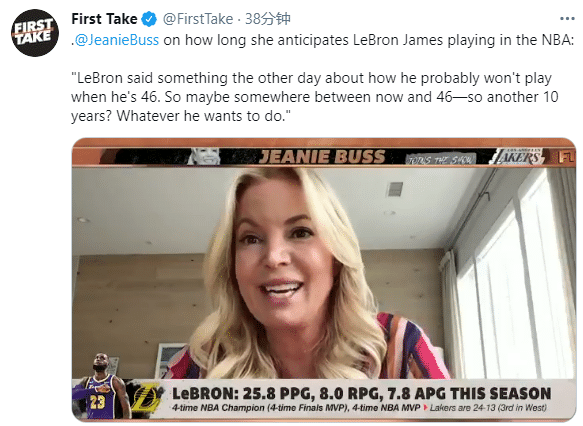 谈到詹姆斯还能在NBA打多久的话题,珍妮-巴斯笑着说:勒布朗曾说过他可能不会打到46岁,因此可能从现在到46岁,也许再打10年吧,无论他想怎样都行!