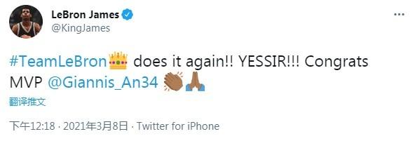 美媒StatMuse和湖人记者Harrison Faigen纷纷发文表示,詹姆斯是联盟最佳总经理。原因是连续4年他的“勒布朗”战队都赢得了胜利。赛后的老詹也是十分兴奋,连续发推“勒布朗队又赢一场!Yessir!!!恭喜MVP@字母哥。”“我终于和你队啦!@库里 这一刻来得太迟了!我爱和你在一起的每一秒!!#历史最伟大射手#由他一人改变了比赛的方式#除了尊敬没有什么可以形容#两个出生在阿克伦的小孩”